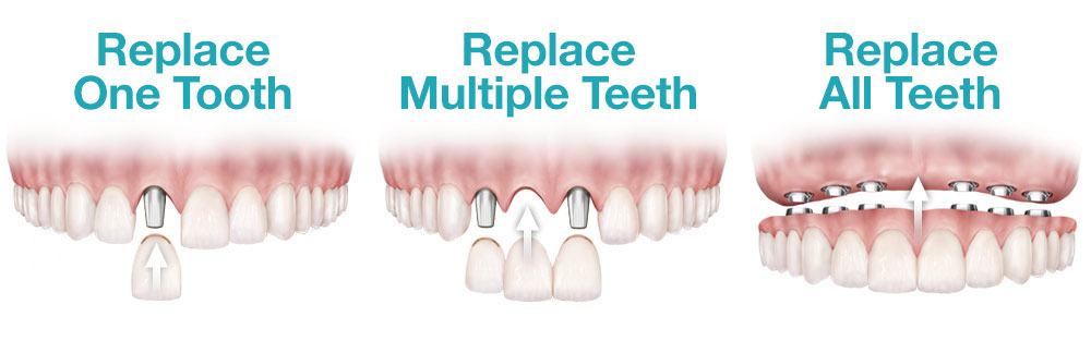 Dental implants are substitutes for the roots of missing teeth. They act as an anchor for a replacement tooth or crown or a set of replacement teeth.